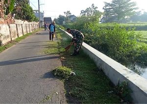 Terlihat Sertu Slamet terjun langsung ke lapangan bersama puluhan warga setempat untuk membersihkan bahu jalan dari rumput liar, sampah plastik, serta merapikan saluran air yang tersumbat.
