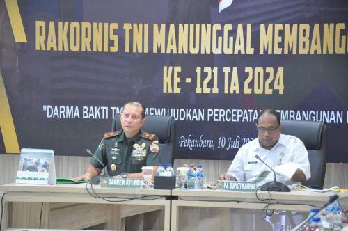 IONECYBER.COM, Pekanbaru – Komandan Korem (Danrem) 031/Wira Bima Brigjen TNI Dany Rakca, S.A.P., M.Han. mengikuti rapat koordinasi secara virtual terkait pelaksanaan Program TNI Manunggal Membangun Desa (TMMD) TA. 2024. Rapat ini dilaksanakan pada Rabu 10 Juli 2024 dan dihadiri oleh berbagai pihak terkait, termasuk PJU. Kabupaten Kampar dari pemerintah daerah, instansi terkait, dan perwakilan masyarakat.