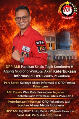 IONECYBER.COM, Pekanbaru – Dewan Pimpinan Pusat Aliansi Media Indonesia (DPP AMI), akan terus tagih komitmen Wali Kota Pekanbaru, H. Agung Nugroho, terkait kemudahan akses informasi bagi insan pers di lingkungan Pemerintah Kota Pekanbaru hingga penghujung 2026 akan datang.