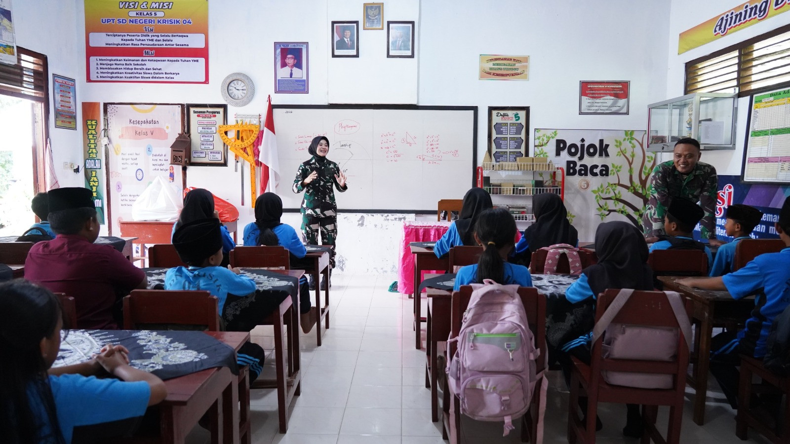 Sertu (K) Mira salah satu personel Satgas TMMD ke 127 Kodim 0808/Blitar, terlihat mengambil peran sebagai guru dengan berinteraksi langsung dengan para pelajar di ruang kelas UPT SD Negeri 4 Krisik, Selasa (24/02/2026).