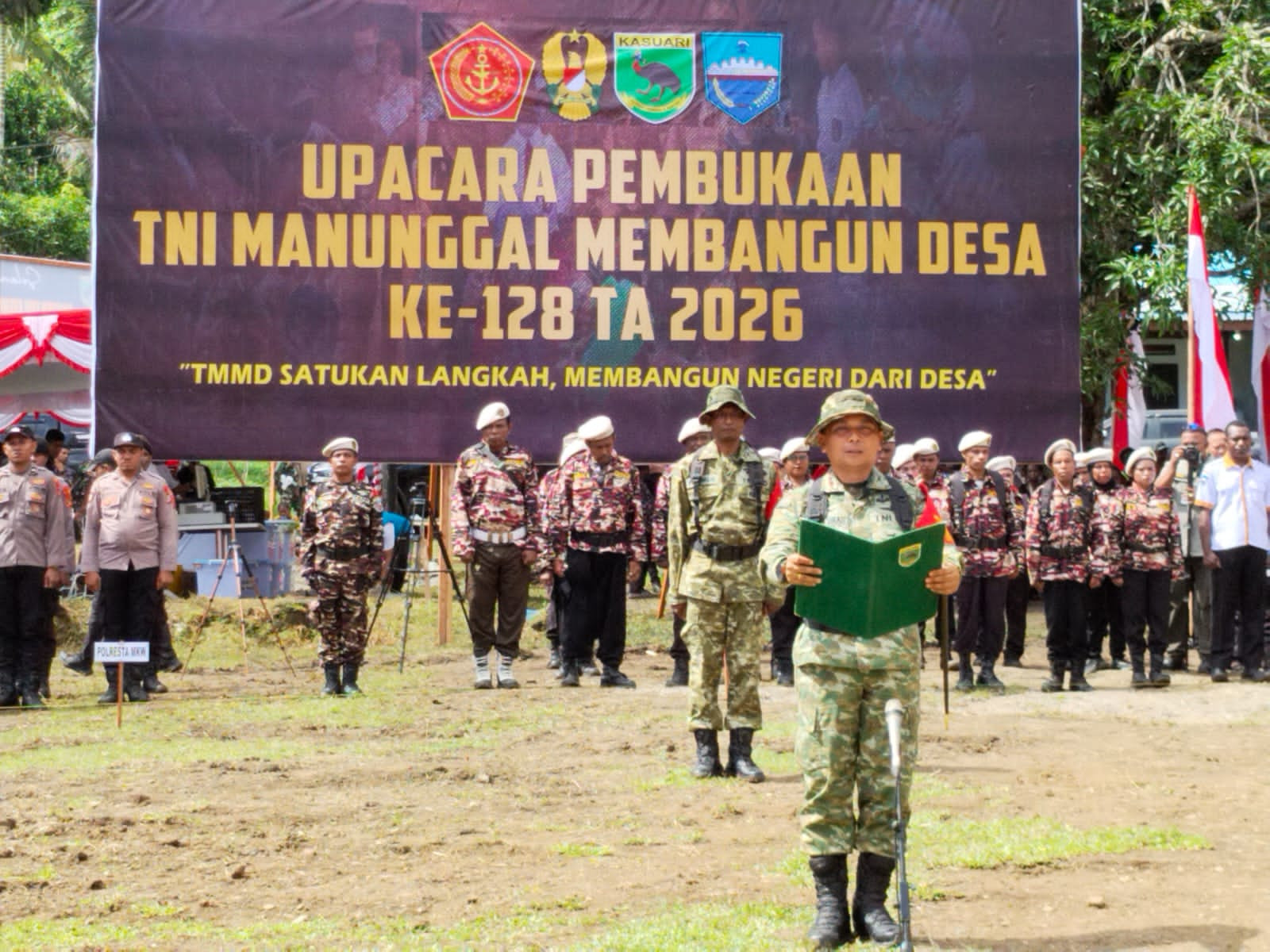 IONECYBER.COM, MANOKWARI (22 April 2026) — Program TNI Manunggal Membangun Desa (TMMD) Ke-128 Tahun Anggaran 2026 secara resmi dibuka di Kampung Tanah Rubuh, Distrik Manokwari Utara, Kabupaten Manokwari, pada Rabu (22/4). Pembukaan dipimpin langsung oleh Bupati Manokwari, Bapak Hermus Indou, S.IP., M.H. serta dihadiri oleh Pangdam XVIII/Kasuari yang diwakili oleh Kasdam XVIII/Kasuari Brijen TNI Dian Hardiana, S.I.P., unsur Forkopimda Kabupaten Manokwari, serta para tokoh masyarakat.